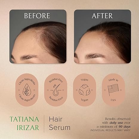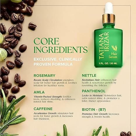 - NATURAL INGREDIENTS FOR ENHANCED HAIR GROWTH: Discover the power of nature with TATIANA IRIZAR’s exclusive hair growth serum for women made in USA. Our formula features clinically proven, naturally derived botanicals, including key ingredients like, Rosemary, Amla, Nettle, Caffeine, Panthenol & Biotin. These compounds are renowned for their ability to support & promote hair health, making them central to our unique blend.